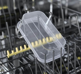 3. Środkowy kosz zwiększa elastyczność i pojemność zmywarki. Składa się z dwóch części: jednej na duże przybory kuchenne, drugiej na szklanki, miski i kubki, które trudno zmieścić na górnym poziomie. Ma własną strefę spryskiwania, a oba kosze można wyjąć osobno, co ułatwia załadunek i zwiększa miejsce w dolnym koszu.